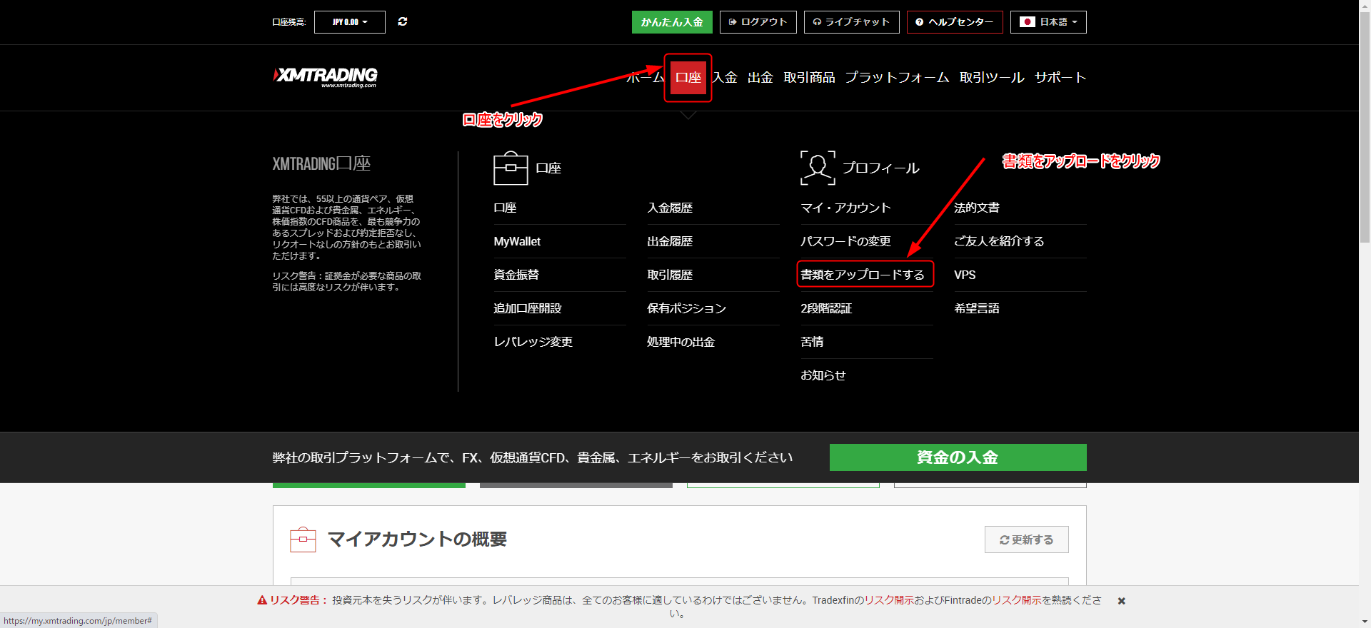 7.ログイン後画面の口座にアクセスすると書類アップロードがあるのでここから書類のアップロードをしました。