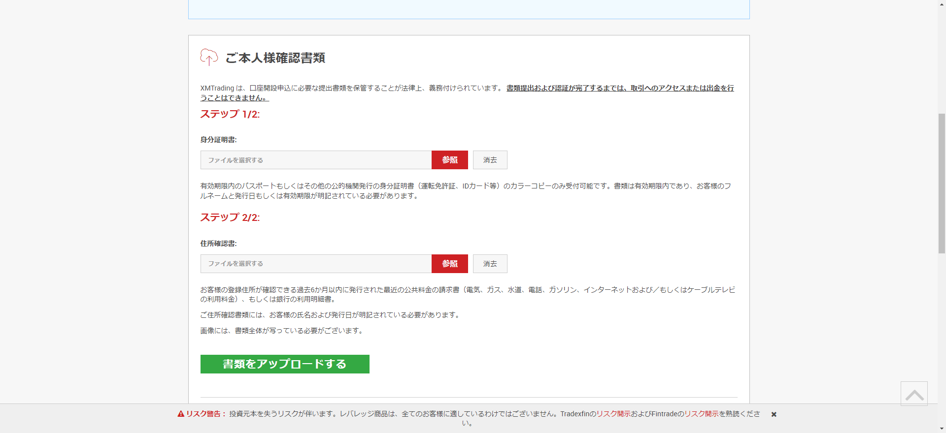 画面の通りに、身分証明、住所確認書類のファイルをアップロードしました。私の場合は身分証明については運転免許、住所確認は画像には記載なかったんですが、6カ月以内に取得した住民票を提出しましたが、通りました。