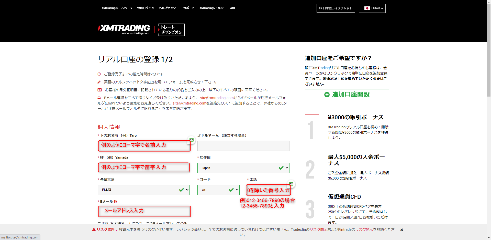 正直なところ、XMで登録した後に、HFM、exnessも口座開設しましたがやり方はほとんど同じ(共通)でした。ここではXMの当時登録した流れのスクショを撮ってあるので参考までに載せたいと思います。