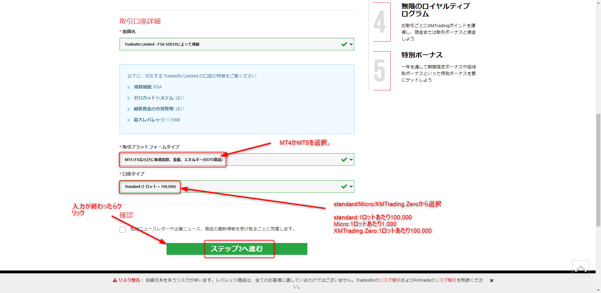 3.取引プラットフォーム(MT4 または MT5)を選択し、口座タイプを選択して次へ進む