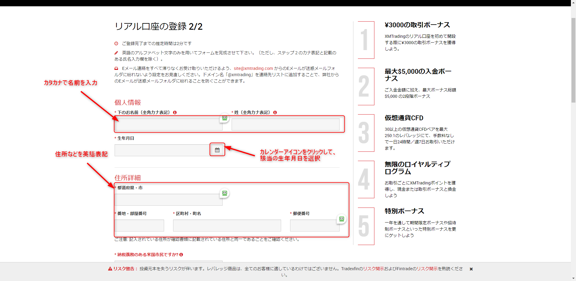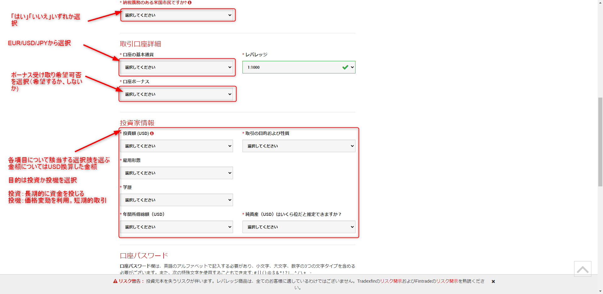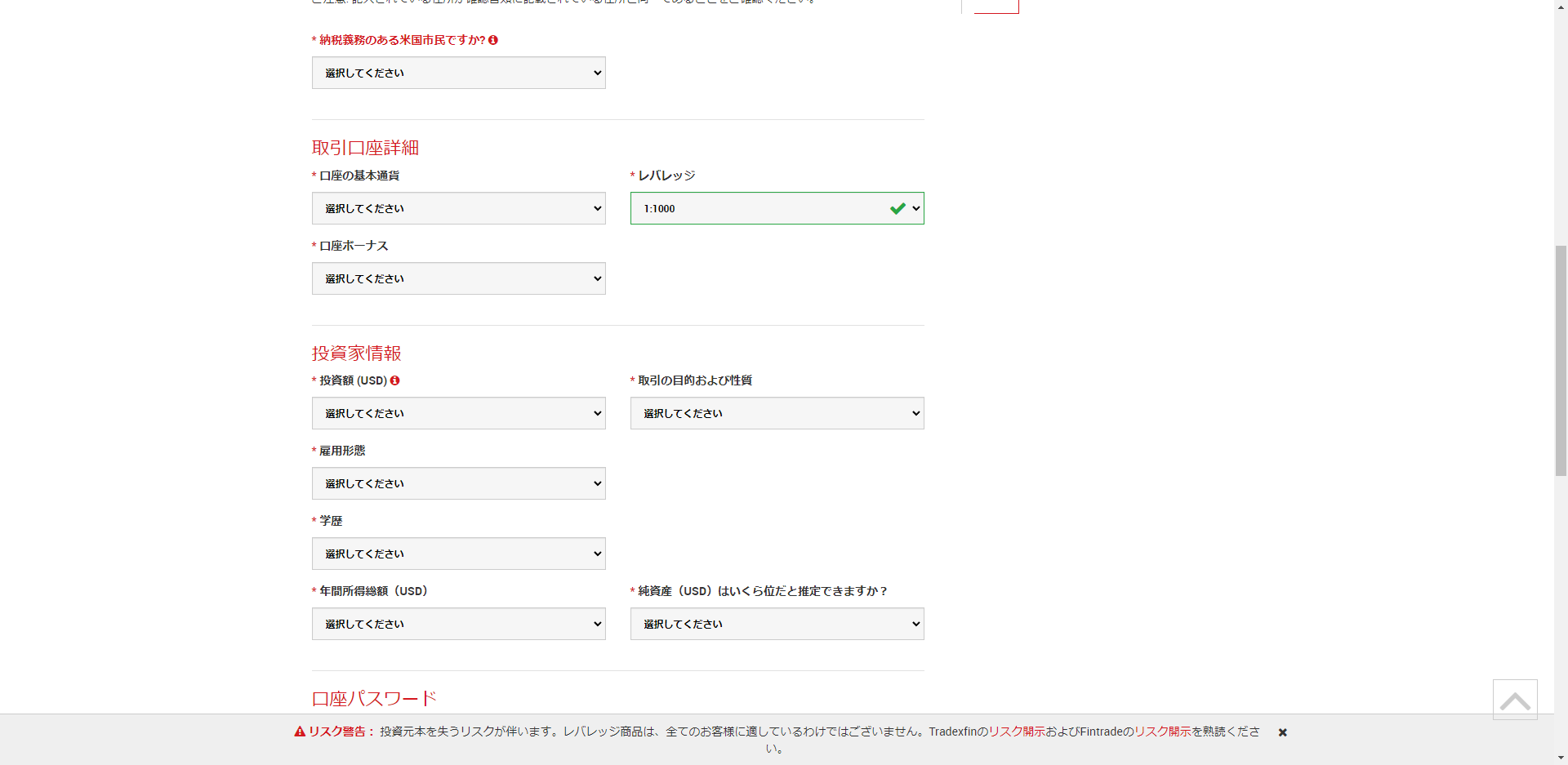 5.納税義務の質問や投資家情報については自身の情報をリストから選択して入力していきました。取引口座については基本通貨はUSD、ボーナス利用をリストから選択して次へ進みます。