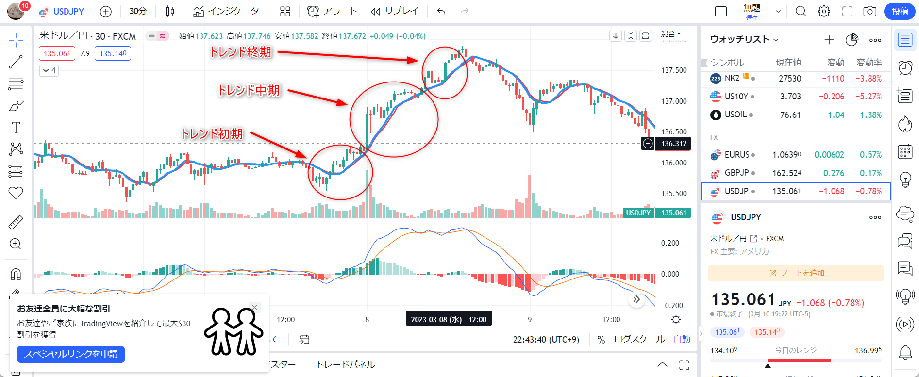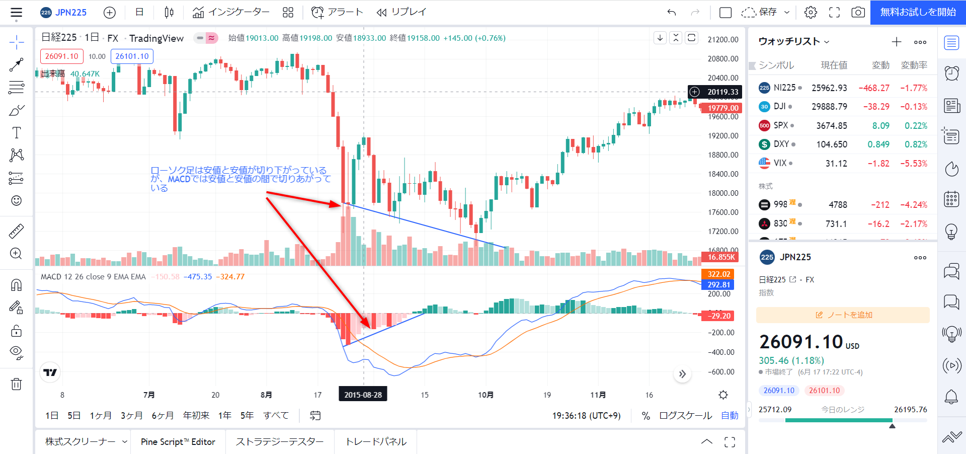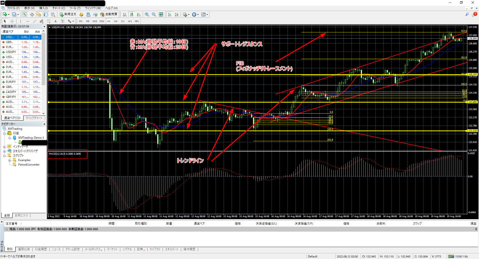 ここでは10日線、20日線を引きます。サポレジとして使いました。これについては主要な高値、安値に対して水平線を引くこともありますが、MAを使うことが多いです。