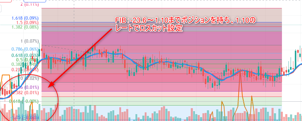 エントリータイミング:FIBを引き、現在のレートで打診でエントリー、あとはFIBの23.6/38.2/61.8/100/105/110あたりで指値でエントリーしています。