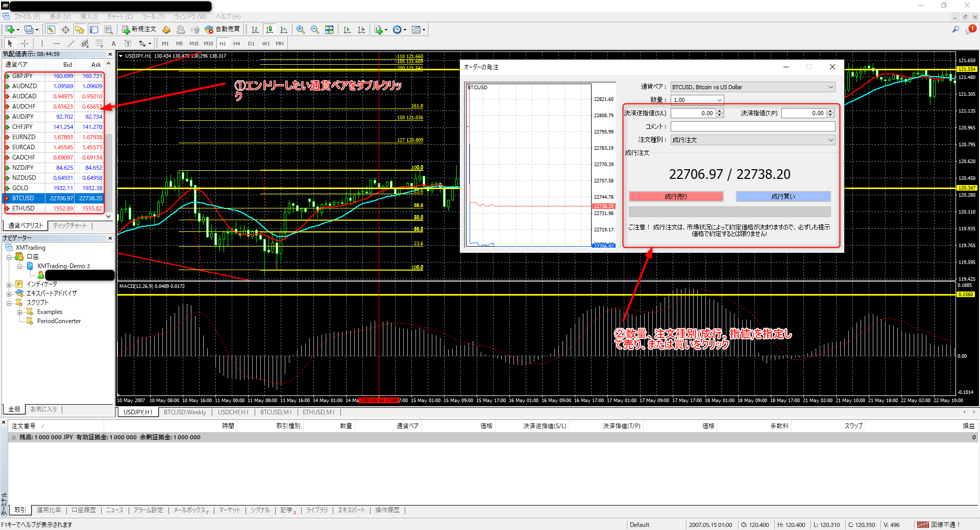 実際にトレードする際は画面左にある通貨ペアリストの任意の通貨ペアをダブルクリックしてエントリー画面を出して、指値または成行でエントリーします。