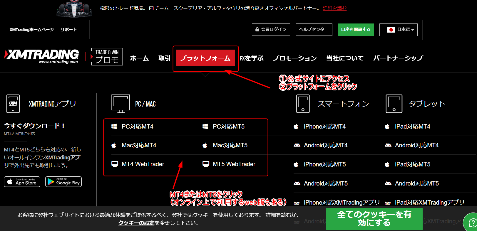 XMの場合は口座開設をした上でプラットフォームというリンクからMT4またはMT5をダウンロードできます。口座開設自体は後でもいいですが、どのみちMTを使うにはログインが必要になるので、事前にやりました。